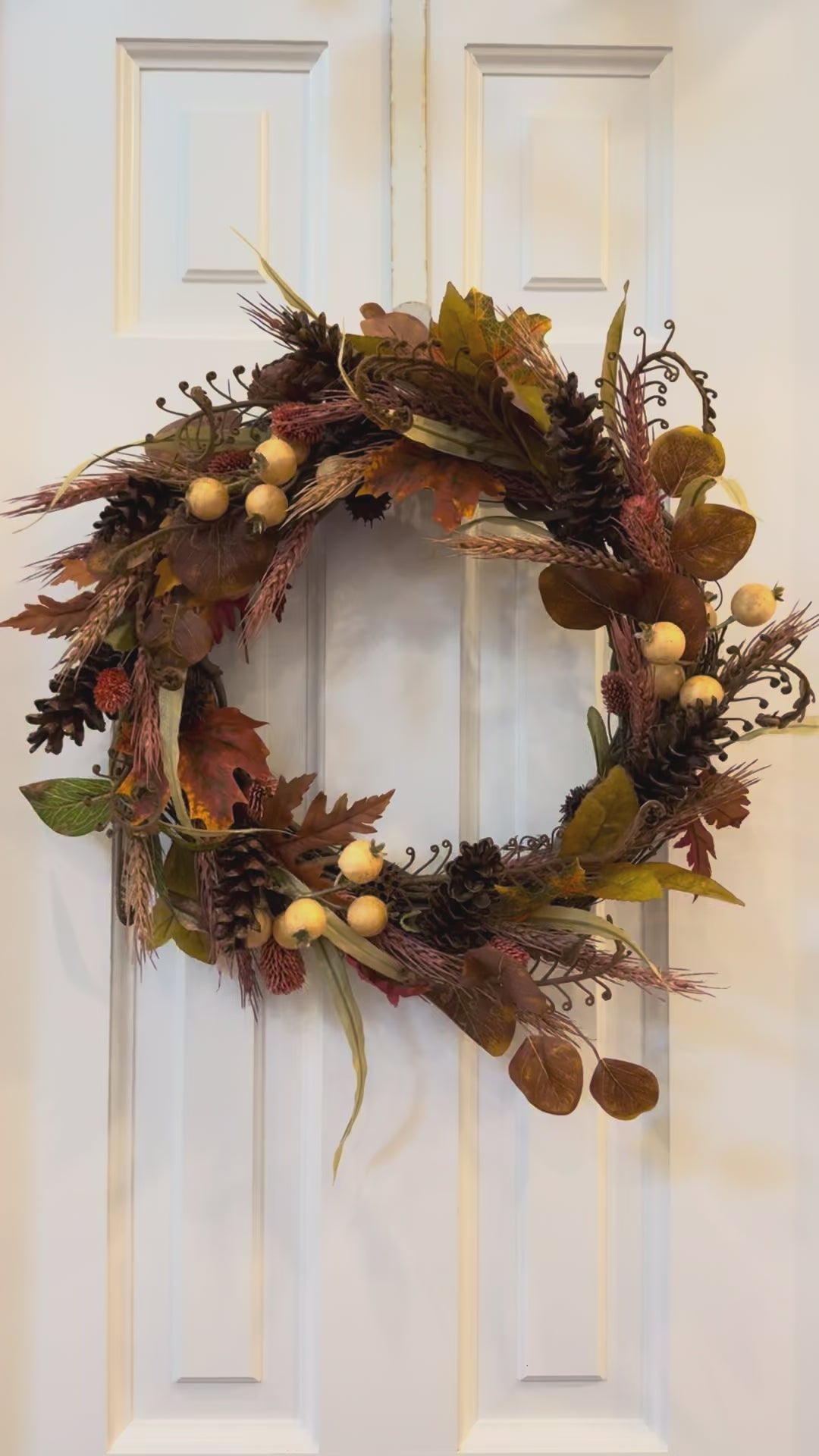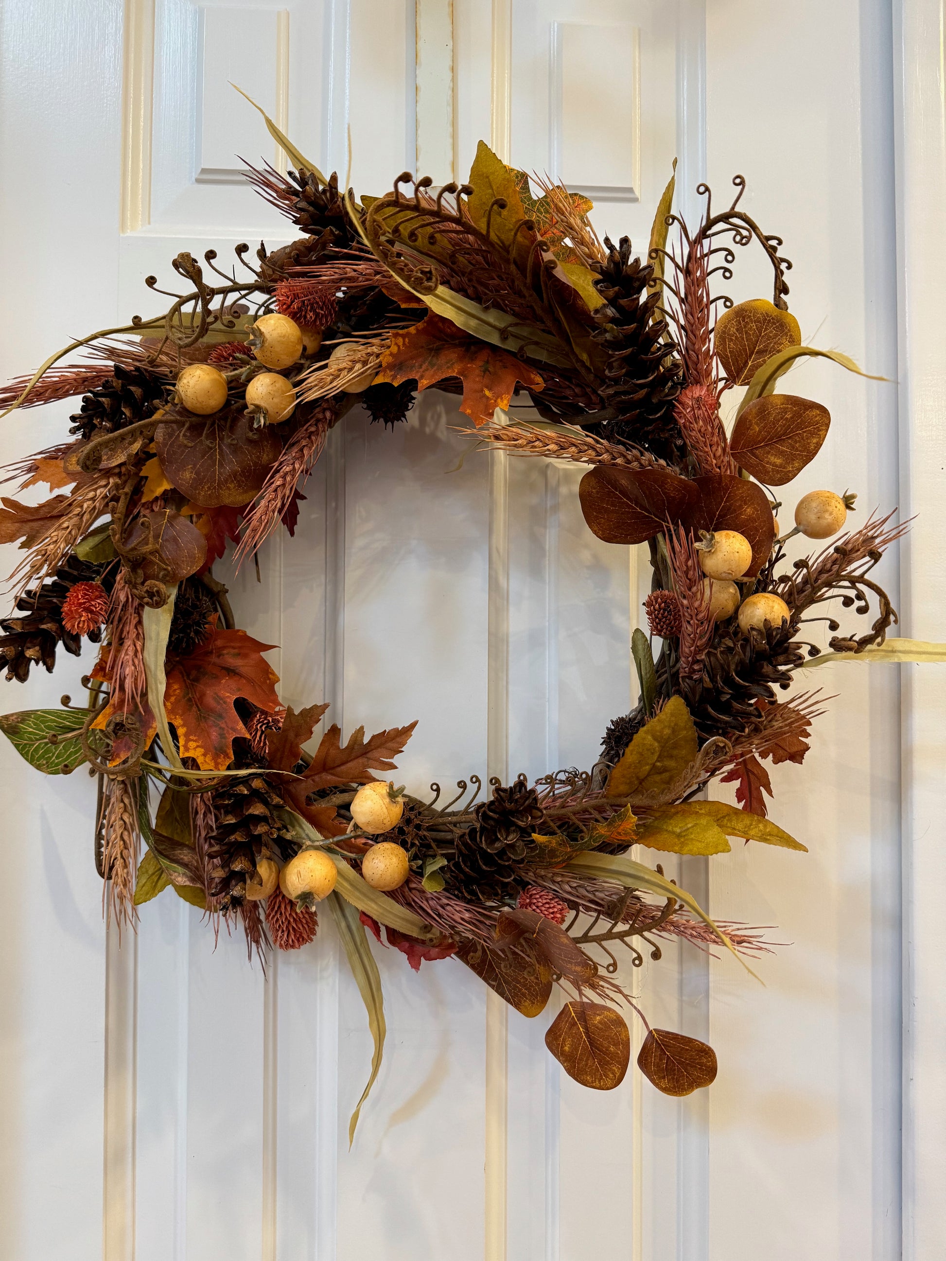 This 16-inch fall wreath features a thoughtfully arranged blend of wheat, fiddlehead fern, thistle, and yellow pom berries in rich, earth-tone hues. Designed to add warmth and seasonal appeal, it serves as a welcoming decorative accent for front doors, entryways, and interior spaces throughout the autumn season.