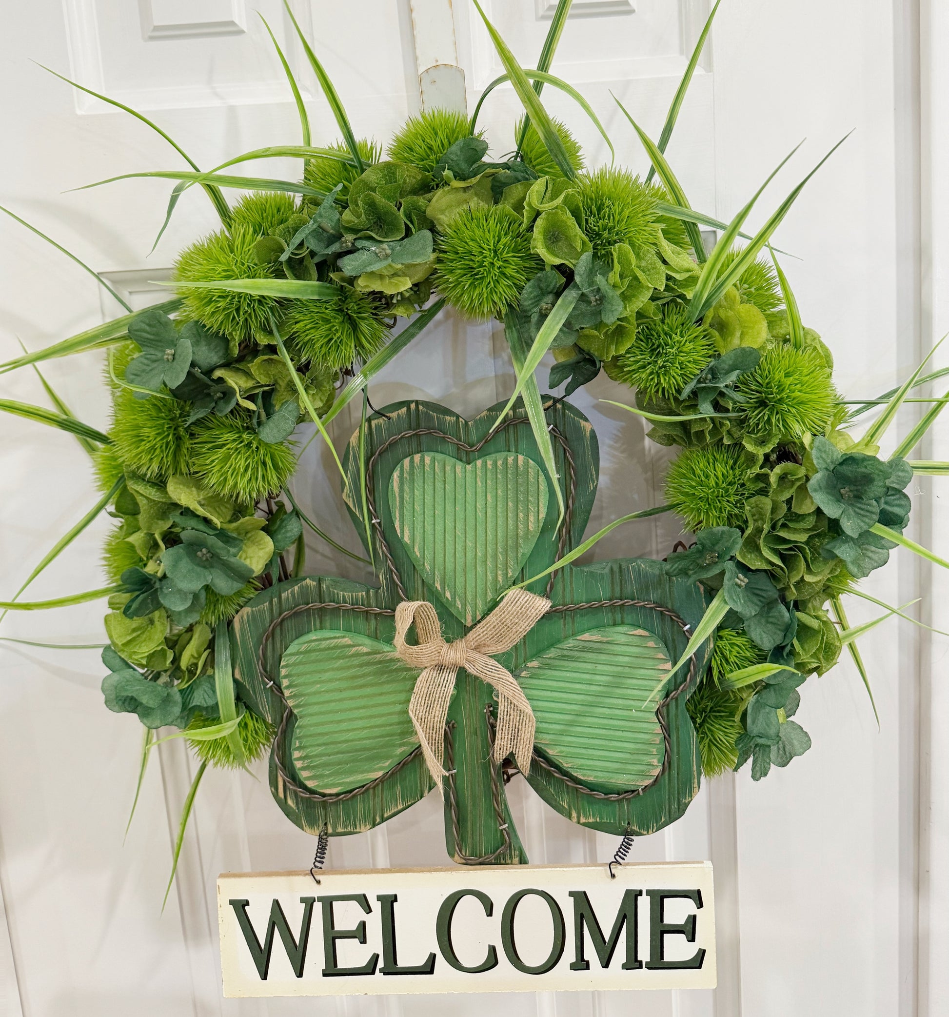 Bring festive Irish charm to your front door with this handcrafted 17" St. Patrick’s Day welcome wreath. This vibrant wreath is designed with silk green carnations and hydrangeas. A wooden-and-wire clover “welcome” sign adds a cheerful accent. Styled entirely in rich green tones, this wreath is perfect for celebrating St. Patrick’s Day, decorating an entryway, or gifting to a host.