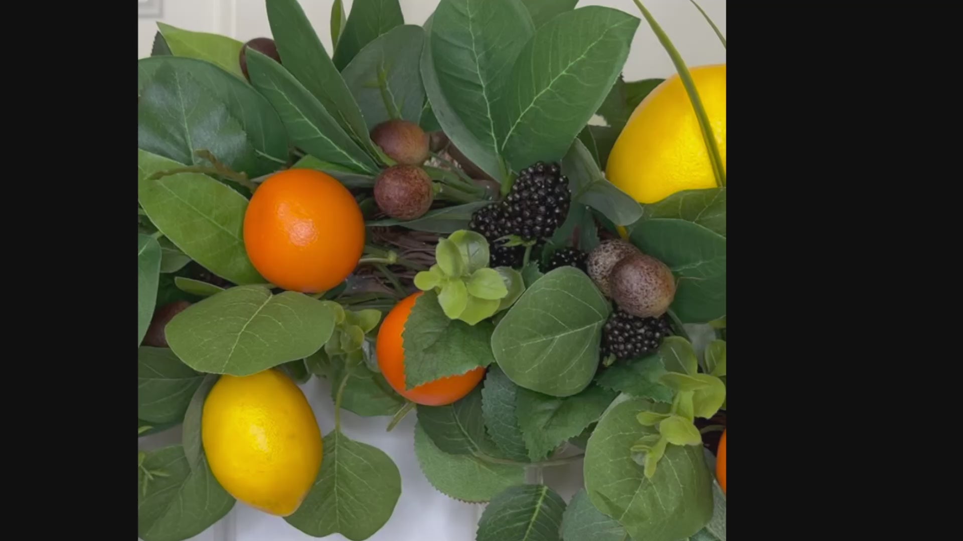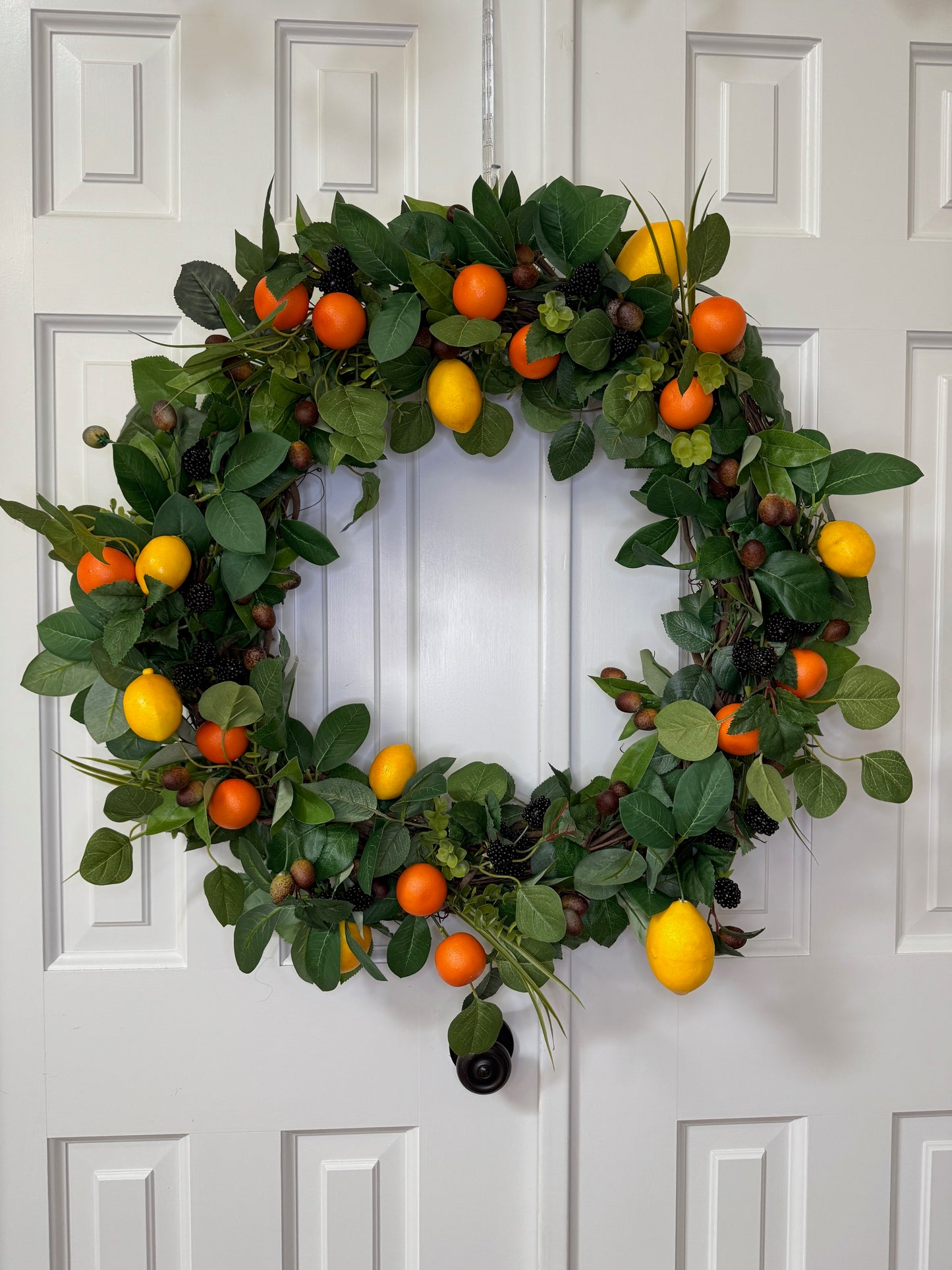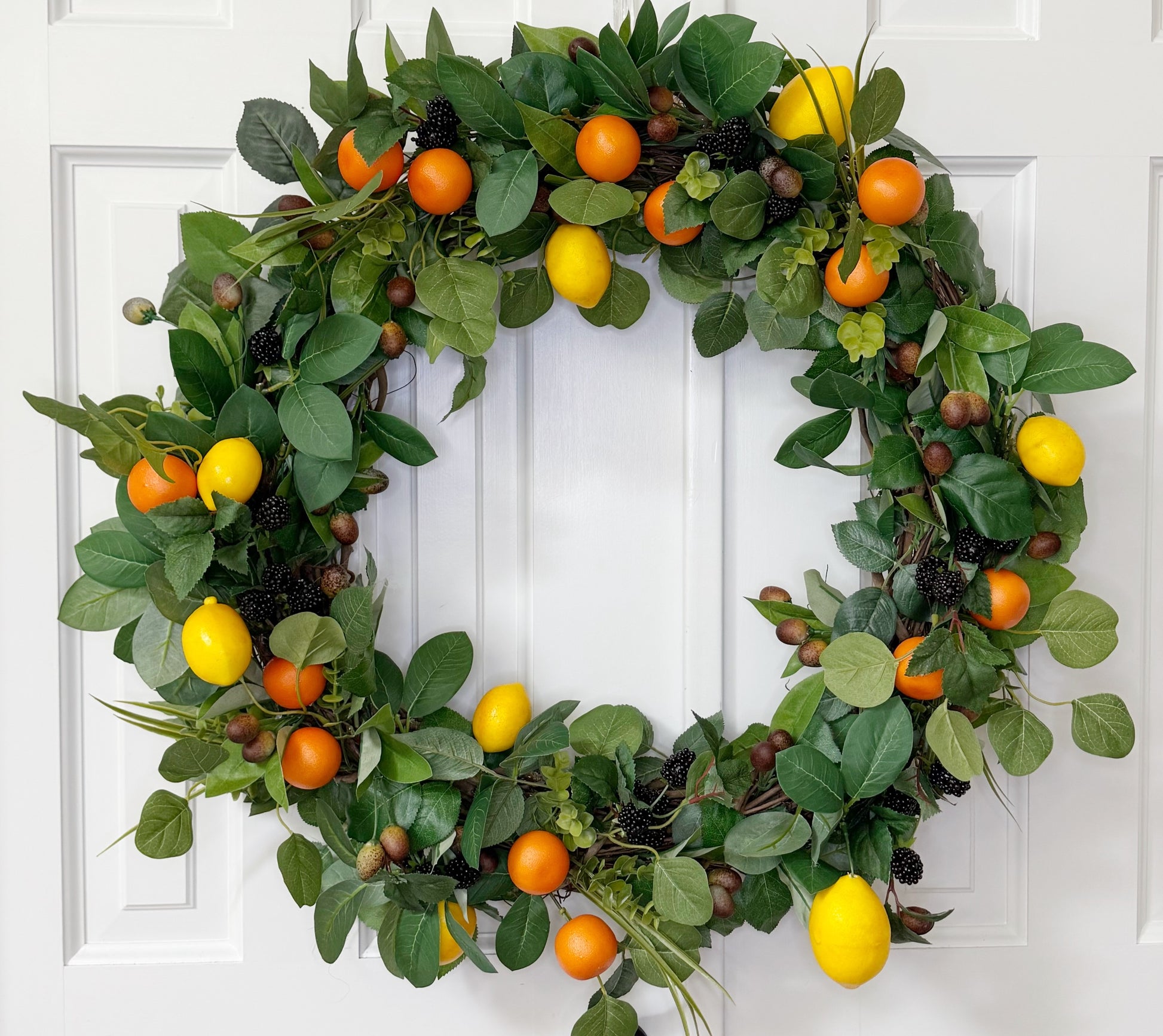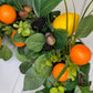Brighten up your summer with this vibrant fruit wreath, bursting with lemons, limes, and olives nestled in lush greenery. Perfect for hanging above your kitchen stove or bringing seasonal charm to your front door.